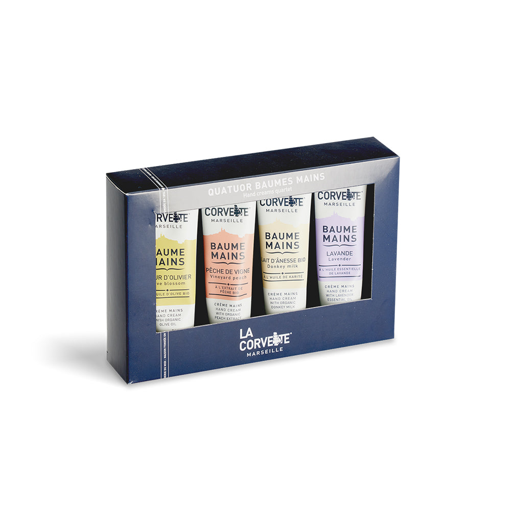 オーガニック由来のピュアオリーブオイルやシアバター、こだわりのオーガニック原料など、天然由来の高保湿成分を配合した人気のハンドクリームを詰め合わせた4種セット。